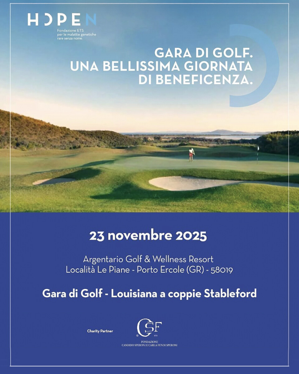 Lo scorso 23 novembre, l’Argentario Golf & Wellness Resort ha ospitato un weekend intenso e ricco di emozioni dedicato alla ricerca sulle malattie genetiche rare senza nome. La Fondazione Candido Speroni e Carla Fendi Speroni ETS desidera ringraziare la Fondazione Hopen ETS e tutti i partecipanti che hanno condiviso con noi questo importante appuntamento.